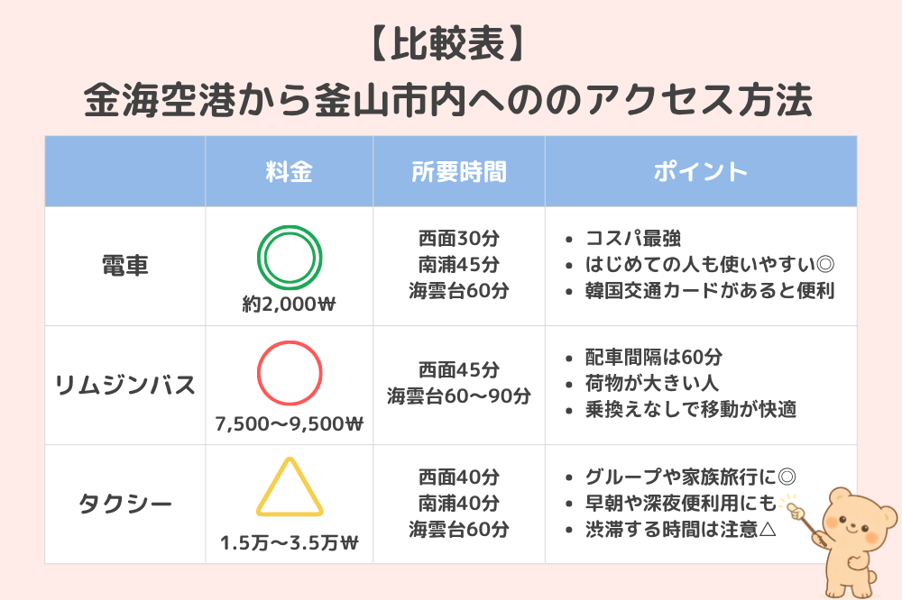 金海空港から釜山市内への主な移動手段は、電車・空港リムジンバス・タクシーの3つです。