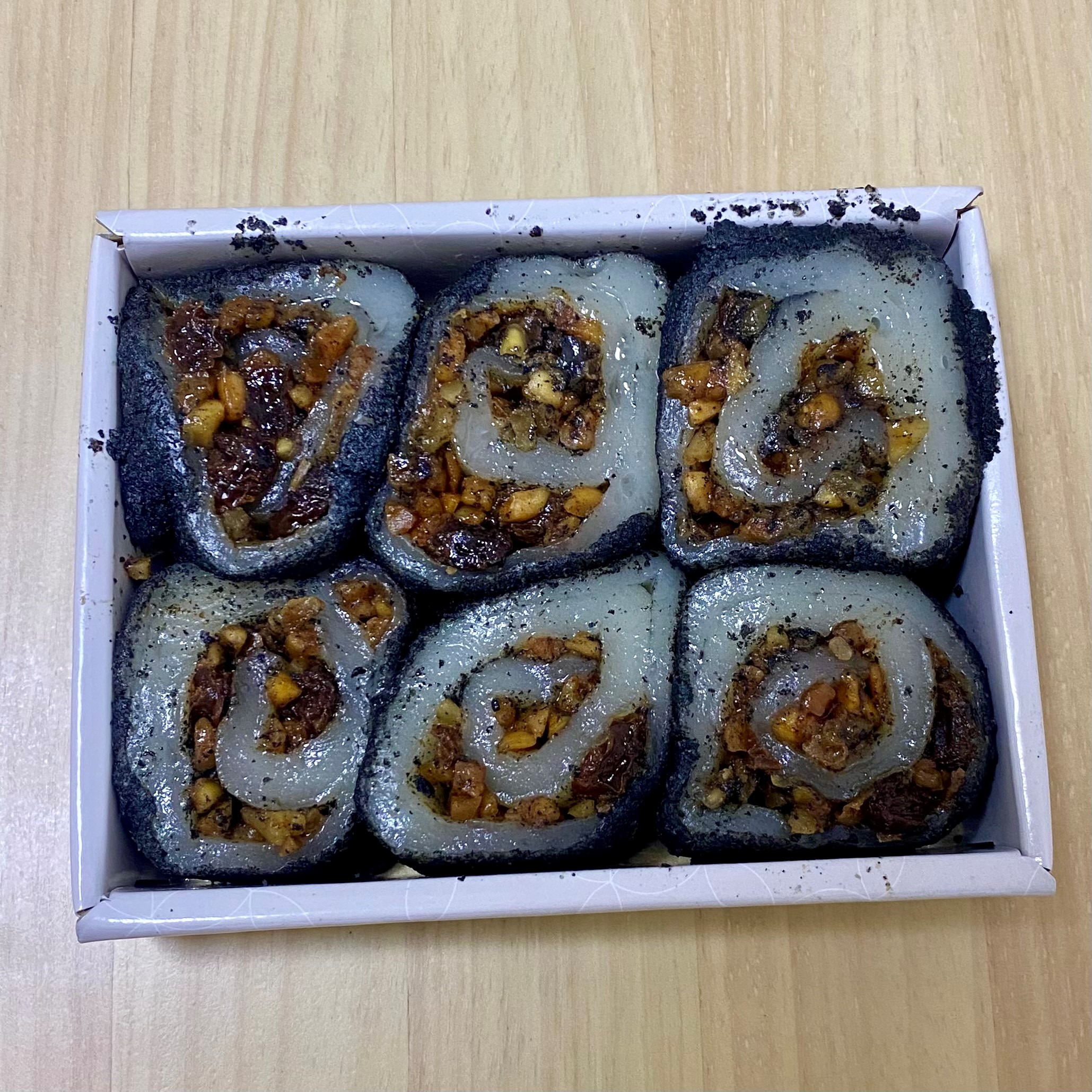 お餅の周りに、黒胡麻のペーストがたっぷりまぶされていて、中には黒蜜やシナモン、ナッツ、レーズンが入っている巻き餅です。ホットクの黒蜜味に近い味がします。