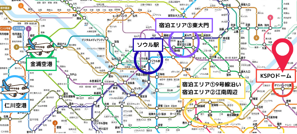 金浦空港から9号線の急行で約40分でアクセスしやすく、当日着でコンサート参戦する人にもおすすめです。