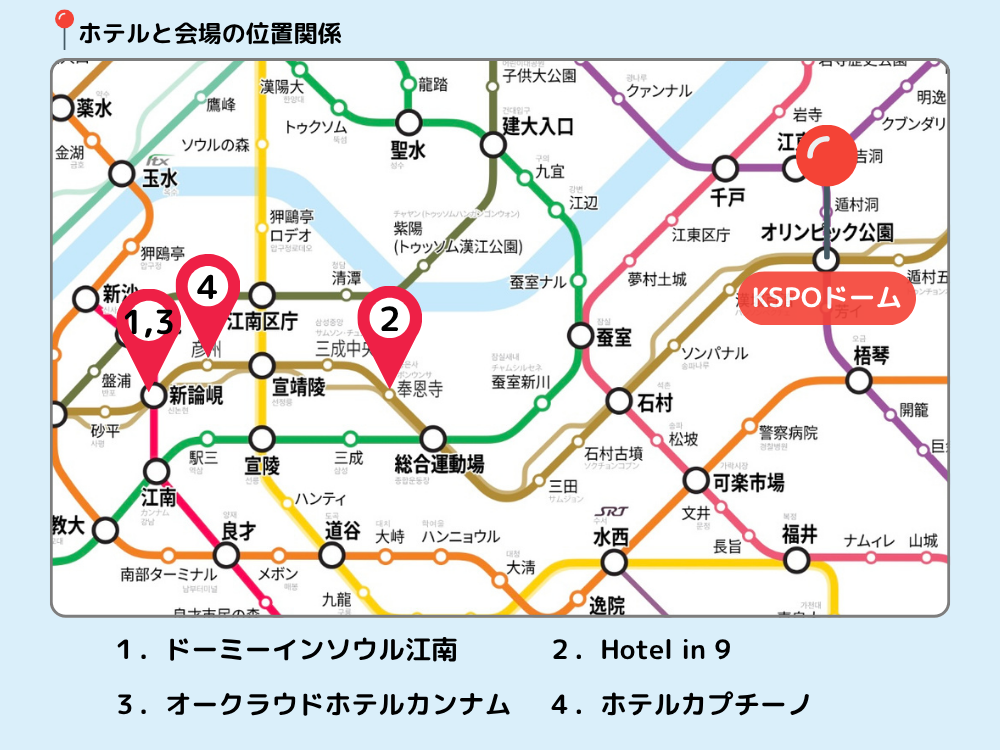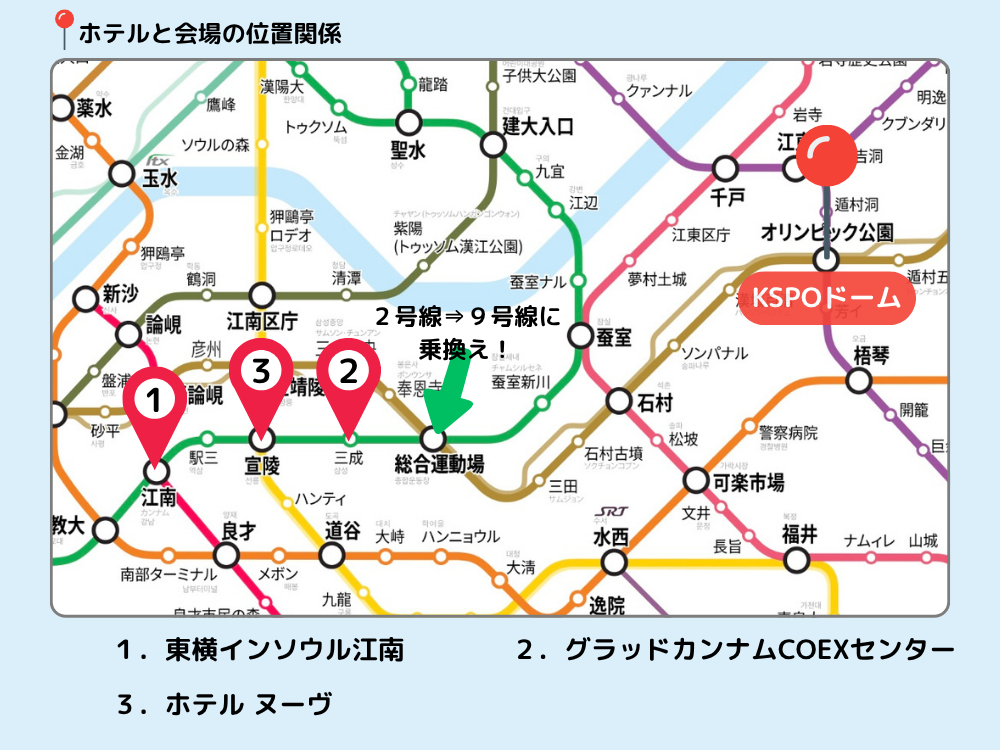 会場最寄のオリンピック公園駅が通る9号線沿いのホテルを選ぶと、乗換なしで会場までのアクセスが便利です。