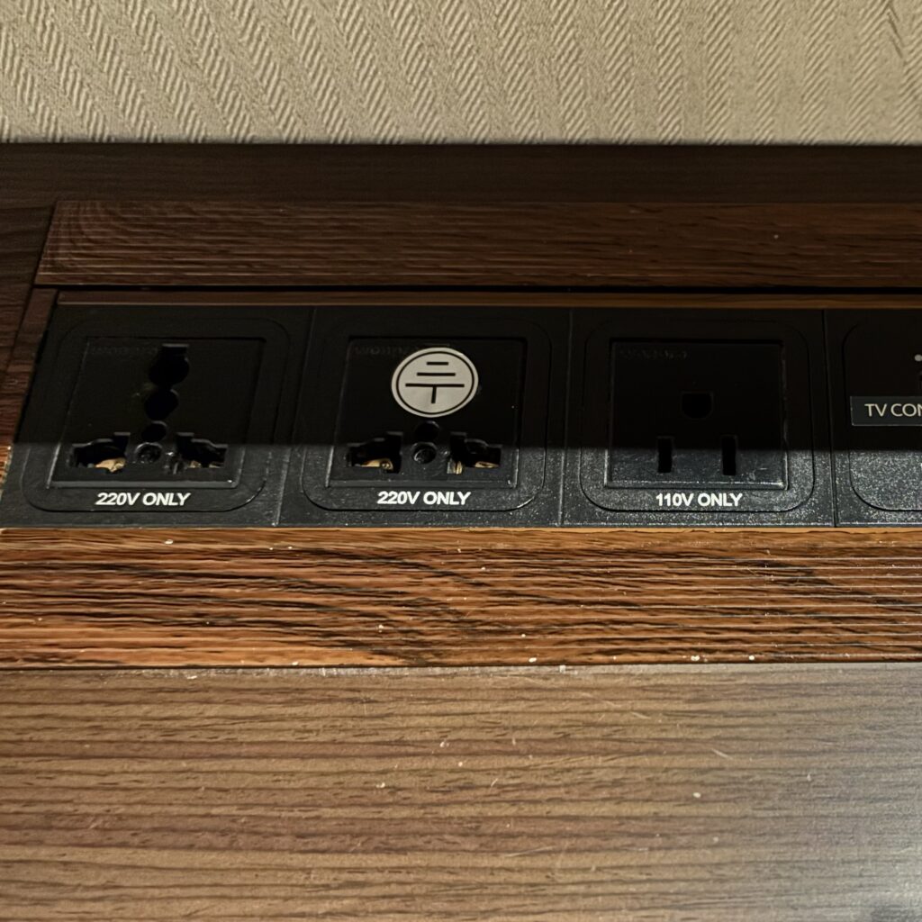 部屋のコンセントは韓国で主流のSE/Cタイプの他に、日本のAタイプの差込み口が1つありました。複数端末を充電する人は、変換プラグを持参しましょう。